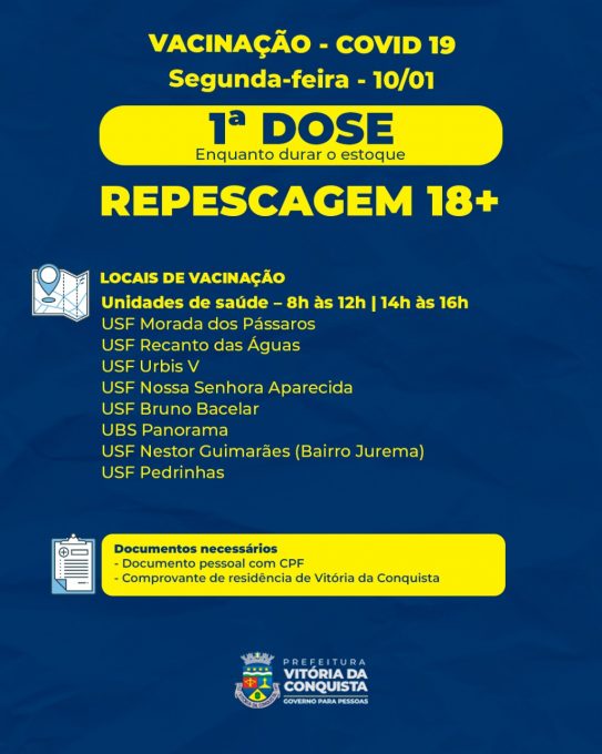 Quem tem mais de 18 anos e ainda não se vacinou com a 1ª dose em 2021, deve procurar uma das seguintes unidades de saúde: Morada do Pássaros, Recanto das Águas, Urbis V, Nossa Senhora Aparecida, Bruno Bacelar, Panorama, Nestor Guimarães (Bairro Jurema) e Pedrinhas.