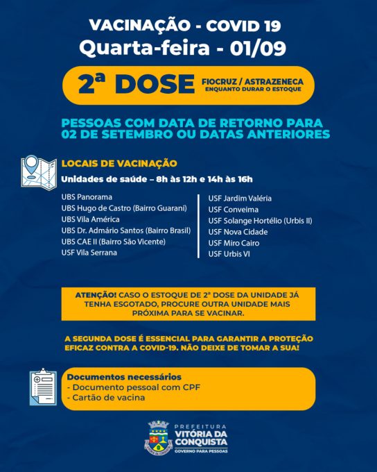 A 2ª dose da AstraZeneca/Oxford/Fiocruz também será aplicada das 8h às 12h e das 14h às 16h, em 12 unidades de saúde: UBS Panorama, UBS Hugo de Castro (bairro Guarani), UBS Vila América, UBS Dr. Admário Santos (bairro Brasil), UBS CAE II (bairro São Vicente), USF Vila Serrana, USF Jardim Valéria, USF Conveima, USF Solange Hortélio (Urbis II), USF Nova Cidade, USF Miro Cairo e USF Urbis VI.