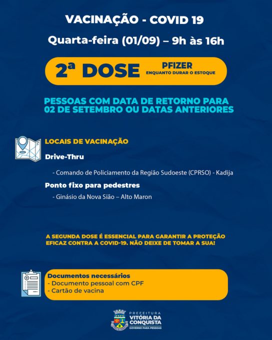 A 2ª dose da Pfizer será aplicada, das 9h às 16h, no drive-thru no Comando de Policiamento da Região Sudoeste (CPRSO), no bairro Kadija, e no ponto fixo para pedestres do Ginásio da Nova Sião, no bairro Alto Maron.