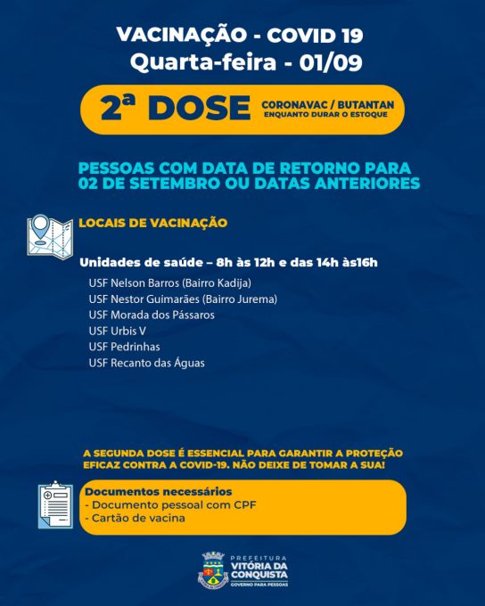 Já a 2ª dose da Coronavac/Butantan, para quem tem retorno marcado para o dia 2 de setembro ou datas anteriores, será das 8h às 12h e das 14h às 16h, em seis unidades de saúde: USF Nelson Barros (Bairro Kadija), USF Nestor Guimarães (Bairro Jurema), USF Morada dos Pássaros, USF Urbis V, USF Pedrinhas e USF Recanto das Águas.
