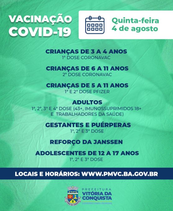 Documentação: Para 1ª dose, é preciso apresentar o documento de identificação pessoal com CPF dos responsáveis e da criança (CPF ou cartão SUS); cartão de vacina; comprovante de residência de Vitória da Conquista. Caso a criança esteja acompanhada por outro responsável maior de 18 anos, os pais devem encaminhar autorização para vacinação por escrito.