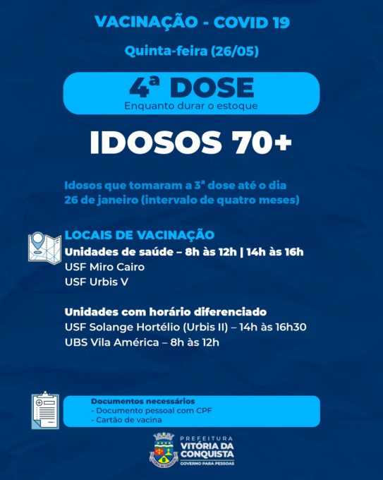 Idosos e imunossuprimidos – A 4ª dose estará disponível apenas para os idosos de 70 anos ou mais e imunossuprimidos maiores de 18 anos, que tomaram as três doses anteriores até o dia 26 de janeiro (intervalo de quatro meses). Os imunossuprimidos que tomaram duas doses até o dia 30 de março (intervalo de 56 dias) podem tomar a 3ª dose.