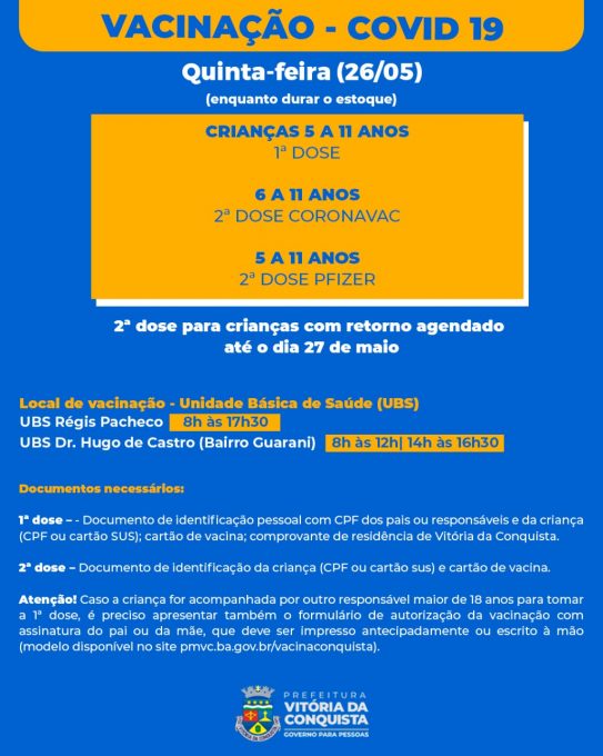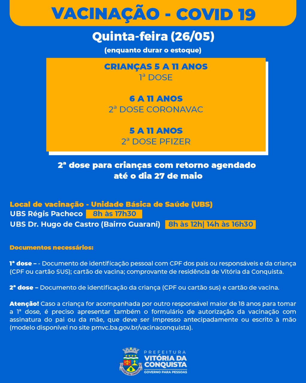 Crianças – O público infantil, entre 5 a 11 anos, poderá ser vacinado com a 1ª dose ou 2ª dose, com retorno agendado até o dia 27 de maio, da Pfizer e da Coronavac. A vacinação ocorre na Unidade de Saúde Régis Pacheco, das 8h às 17h30 (sem intervalo para almoço), ou na Unidade de Saúde Dr. Hugo de Castro (bairro Guarani), das 8h às 12h e das 14h às 16h30.