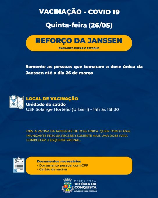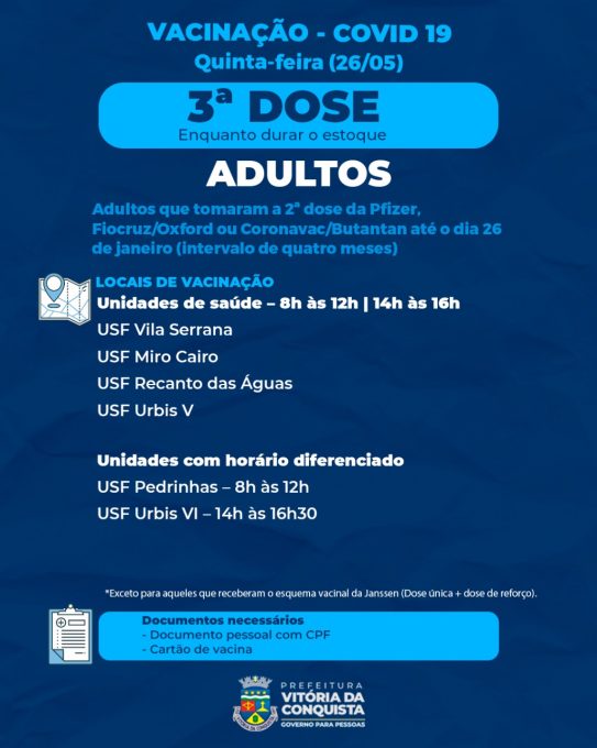 Adultos – A vacinação de reforço, para quem tomou as duas doses da vacina até o dia 26 de janeiro, será nas unidades de saúde Vila Serrana, Miro Cairo, Urbis V e Recanto das Águas, nos dois turnos; na unidade Pedrinhas somente pela manhã, das 8h às 12h; e na Urbis VI, das 14h às 16h30. Quem precisa tomar a dose adicional de reforço da Janssen deve procurar a USF Solange Hortélio, das 14h às 16h30.