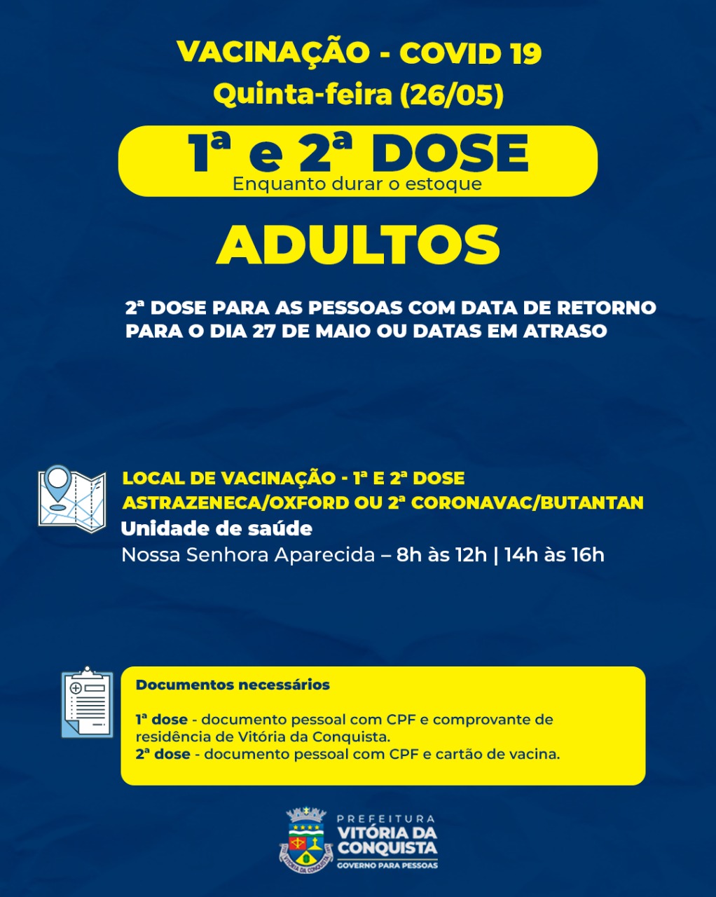 Na unidade Nossa Senhora Aparecida, terá a 1ª dose para quem ainda não se vacinou e a 2ª dose da AstraZeneca/Fiocruz ou Coronavac/Butantan, com retorno agendado até o dia 27 de maio.