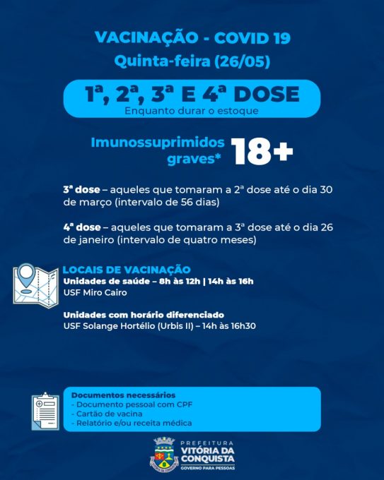 A vacinação contra a Covid-19 nas unidades de saúde, nesta quinta-feira (26), será para crianças, adolescentes, adultos e grupos prioritários, com todas as doses disponíveis. As salas de vacina atendem nos dois turnos, algumas unidades em horários diferenciados, com distribuição de senhas.