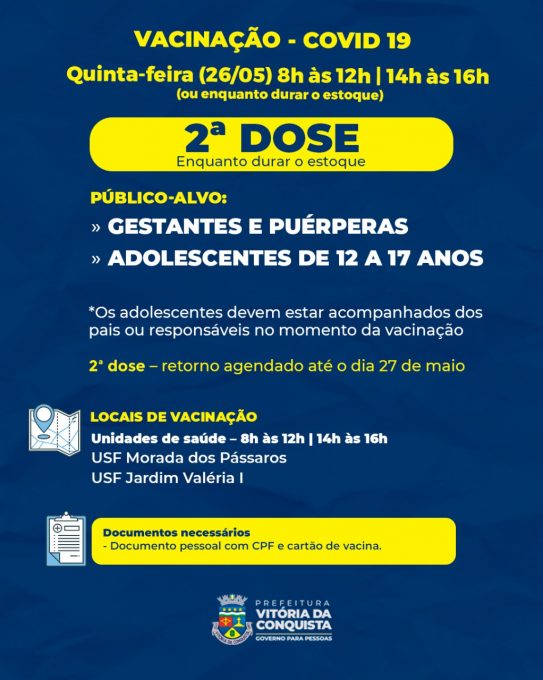 Adolescentes, gestantes e puérperas – Para esses grupos, terá a 2ª dose nas unidades de saúde Morada dos Pássaros e Jardim Valéria I, desde que o retorno esteja agendado para o dia 27 de maio ou datas em atraso. Os pais ou responsáveis devem acompanhar os adolescentes durante a vacinação.