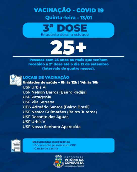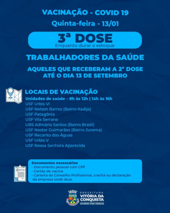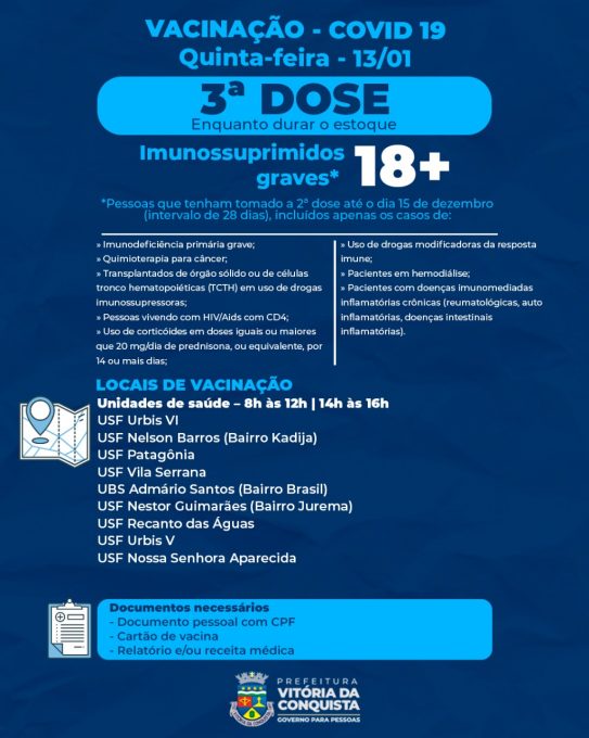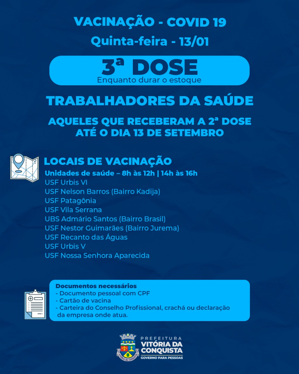 A 3ª dose estará disponível em nove unidades nesta quinta-feira. São elas: USF Urbis VI, USF Nelson Barros (Bairro Kadija), USF Patagônia, USF Vila Serrana, UBS Admário Santos (bairro Brasil), USF Nestor Guimarães (Bairro Jurema), USF Recanto das Águas, USF Urbis V e USF Nossa Senhora Aparecida.