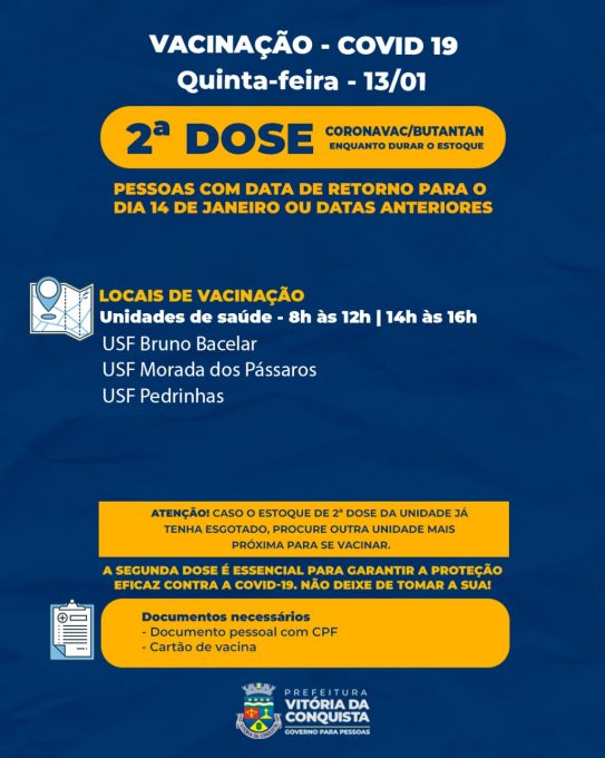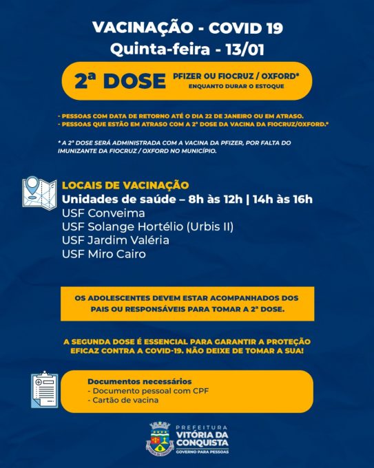 2ª DOSE – Quem tem retorno da 2ª dose da Pfizer até o dia 22 de janeiro, já pode antecipar a vacinação nas unidades de saúde do Conveima, Solange Hortélio (Urbis II), Jardim Valéria e Miro Cairo. As pessoas que estão em atraso para a 2ª dose da Fiocruz/Oxford* também poderão se vacinar nessas mesmas unidades – para estes, será administrada a vacina da Pfizer, por falta do imunizante da Fiocruz/Oxford no município.