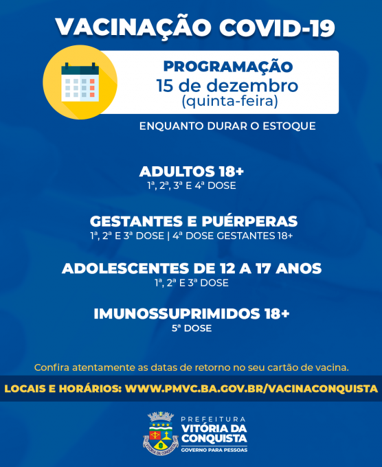 A Secretaria Municipal de Saúde (SMS) mantém a programação de vacinação contra a Covid-19 nas unidades de saúde, nesta quinta-feira (15), com exceção apenas da 1ª e 2ª doses para crianças de seis meses a 11 anos, por falta de estoque de vacinas para esse público. A reposição já foi solicitada à Secretaria de Saúde do Estado da Bahia (Sesab), mas ainda não há previsão de recebimento.