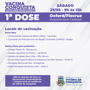 A vacinação de amanhã será de 9h às 13h, nos drive-thrus no Comando de Policiamento da Região Sudoeste (CPRSO) e na Universidade Federal da Bahia (Ufba), e pontos fixos para pedestres no Colégio Paulo VI, quadra esportiva da Fainor, quadra da Igreja Nova Sião, Escola Municipal Professora Fidelcina Carvalho Santos, Paróquia Rainha da Paz e Salão Paroquial da Santa Luzia.