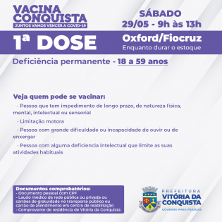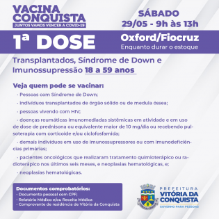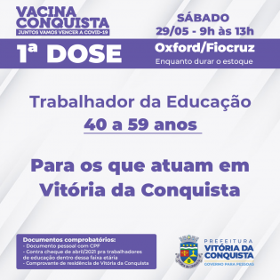 – Trabalhadores da Educação que atuam em Vitória da Conquista, com idade entre 40 a 59 anos. No momento da vacinação é necessário apresentar o contracheque de abril de 2021.