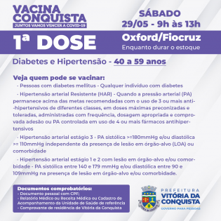 – Qualquer pessoa, entre 40 a 59 anos, com diabetes mellitus ou hipertensão, desde que atenda os critérios para vacinação*. Como documento comprobatório, deve apresentar relatório médico, receita médica ou cadastro de acompanhamento da Unidade de Saúde de referência.
