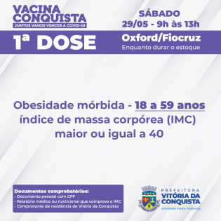 – Pessoas com obesidade mórbida com Índice de Massa Corpórea (IMC) maior ou igual a 40, de 18 a 59 anos. Para se vacinar, é necessário apresentar relatório médico ou nutricional que comprove o IMC.