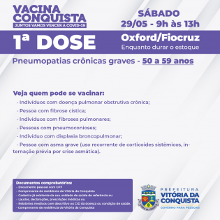 Neste sábado (29), terá vacinação em Conquista com 1ª e 2ª dose da AstraZeneca/Oxford, desta vez incluindo mais um grupo prioritário de portadores de doenças crônicas e condições clínicas especiais: pessoas com pneumopatias crônicas graves, na faixa etária de 50 a 59 anos. Ontem, com a retomada da 1ª dose, 2.777 pessoas receberam a primeira aplicação. Já 386 pessoas garantiram a 2ª dose.