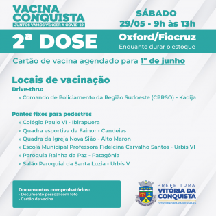 A 2ª dose da AstraZeneca/Oxford também estará disponível, no drive-thru do CPRSO e em todos os pontos fixos para pedestres, para aqueles com data agendada no cartão de vacina até o dia 1º de junho.