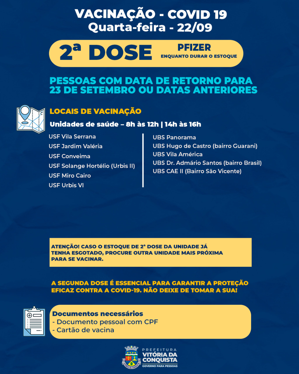 SEGUNDA DOSE – Para as pessoas que estão com data de retorno agendada para o dia 23 de setembro ou datas anteriores, a vacinação será feita das 8h às 12h e das 14h às 16h, em 22 unidades de saúde, divididas por tipos de vacinas.