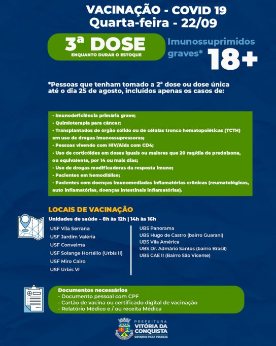 A 3ª dose para os idosos de 80 anos ou mais e os imunossuprimidos graves com 18 anos ou mais, ocorre das 8h às 12h e das 14h às 16h, nas unidades: UBS Panorama, UBS Hugo de Castro (bairro Guarani), UBS Vila América, UBS Dr. Admário Santos (bairro Brasil), UBS CAE II (bairro São Vicente), USF Vila Serrana, USF Jardim Valéria, USF Conveima, USF Solange Hortélio (Urbis II), USF Miro Cairo e USF Urbis VI.