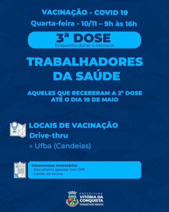 Já a 3ª dose será apenas para os trabalhadores da saúde que tomaram a 2ª dose até o dia 10 de maio, no ponto de vacinação de drive-thru na UFBA, bairro Candeias. É indispensável que o profissional apresente o cartão de vacina e documento pessoal com CPF no momento da vacinação.