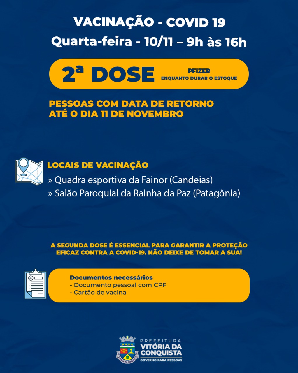 A 2ª dose da Pfizer estará disponível para as pessoas com data de retorno agendada para o dia 11 de novembro ou datas anteriores, nos pontos fixos do Salão Paroquial da Rainha da Paz (Patagônia) e quadra esportiva da Fainor (Candeias).