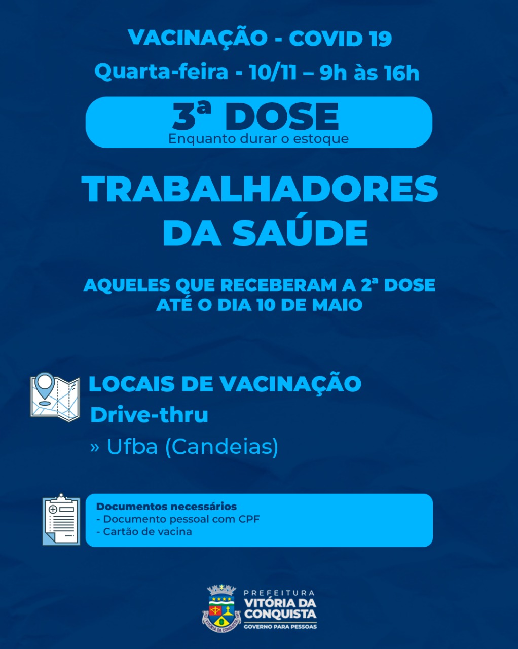 Já a 3ª dose será apenas para os trabalhadores da saúde que tomaram a 2ª dose até o dia 10 de maio, no ponto de vacinação de drive-thru na UFBA, bairro Candeias. É indispensável que o profissional apresente o cartão de vacina e documento pessoal com CPF no momento da vacinação.