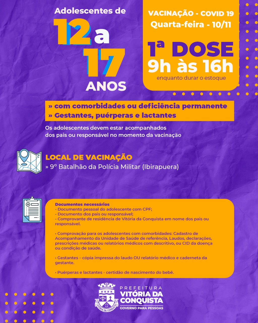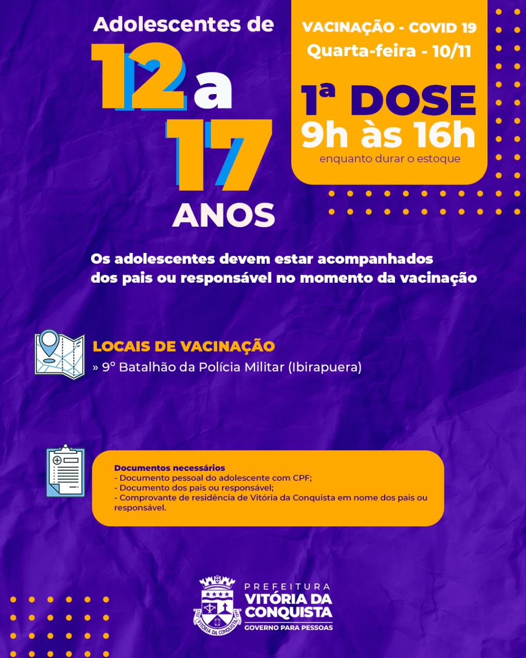 A vacinação para os adolescentes será apenas no ponto fixo do 9º Batalhão da Polícia Militar (Ibirapuera), no bairro Ibirapuera. Para se vacinar, o adolescente deve estar acompanhado dos pais ou responsável, portando toda a documentação exigida.