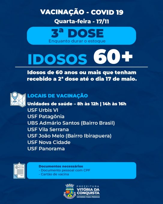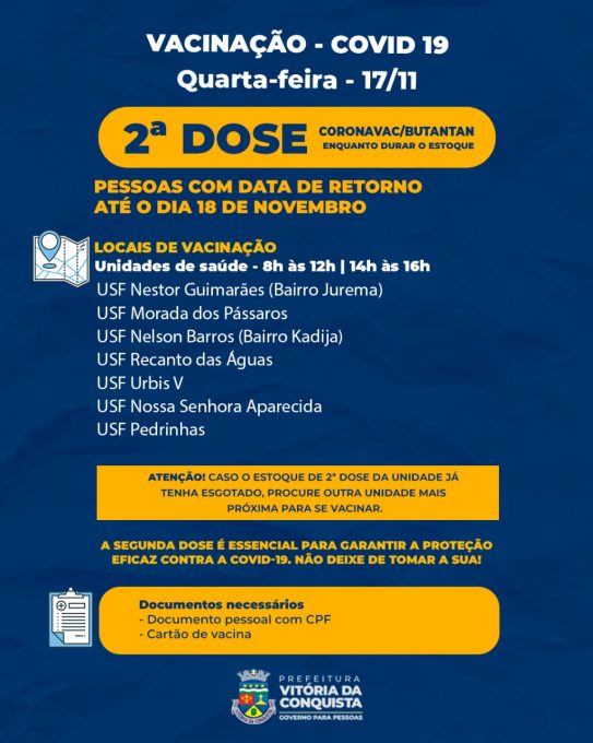 Nesta quarta-feira (17), a vacinação em Vitória da Conquista será somente da 2ª dose da Coronavac/Butantan para quem data marcada até o dia 18 de novembro e da 3ª dose para idosos de 60 anos ou mais que tomaram a 2ª dose até o dia 17 de maio e para imunossuprimidos que receberam a 2ª dose até o dia 19 de outubro.