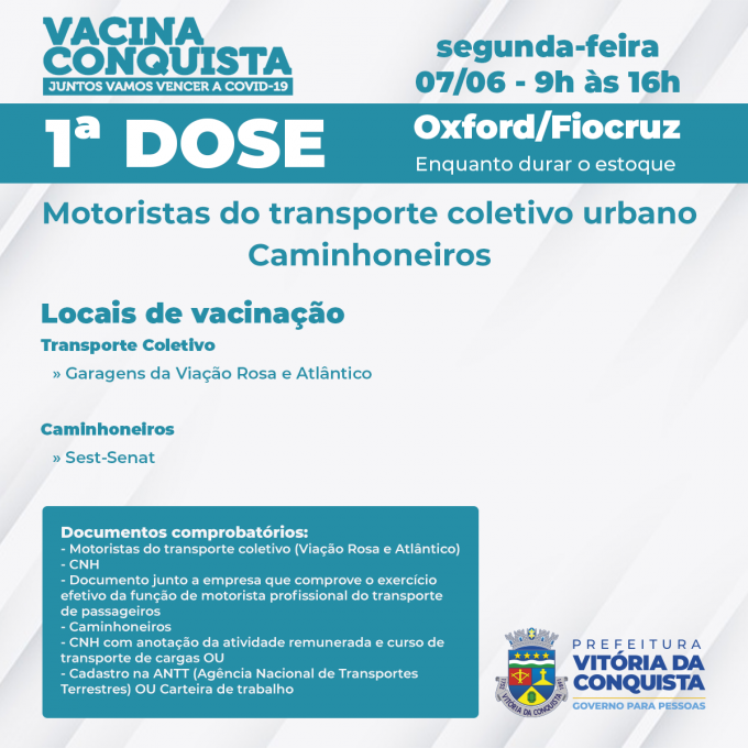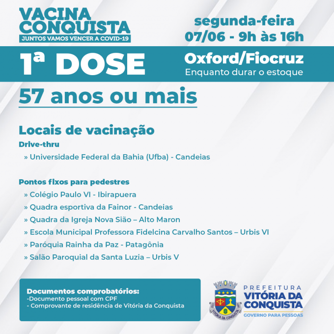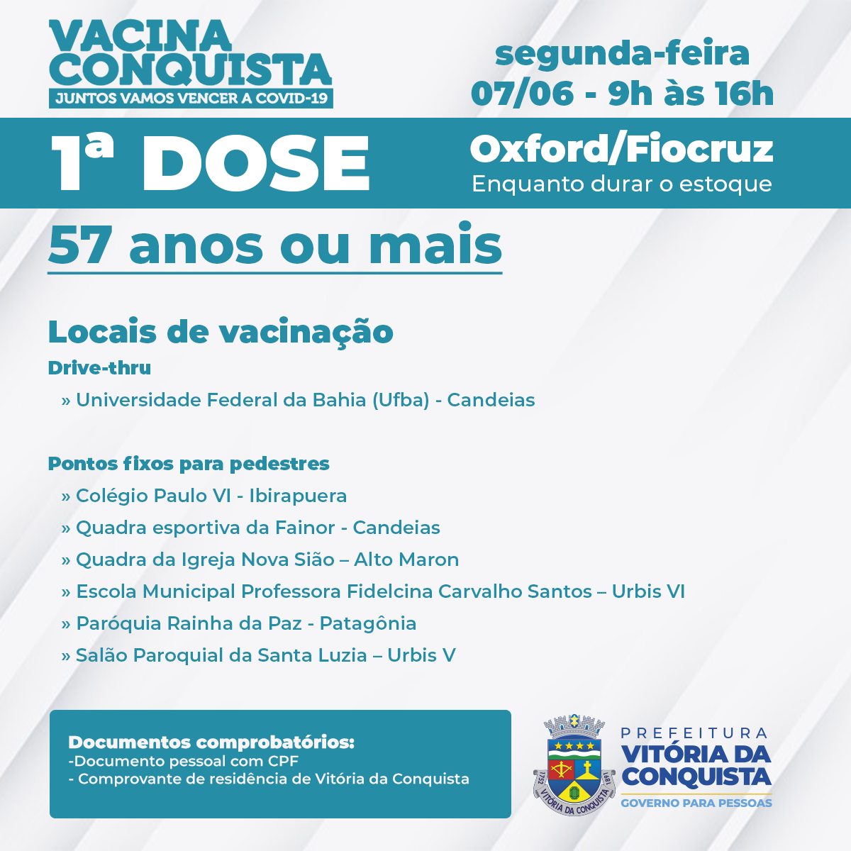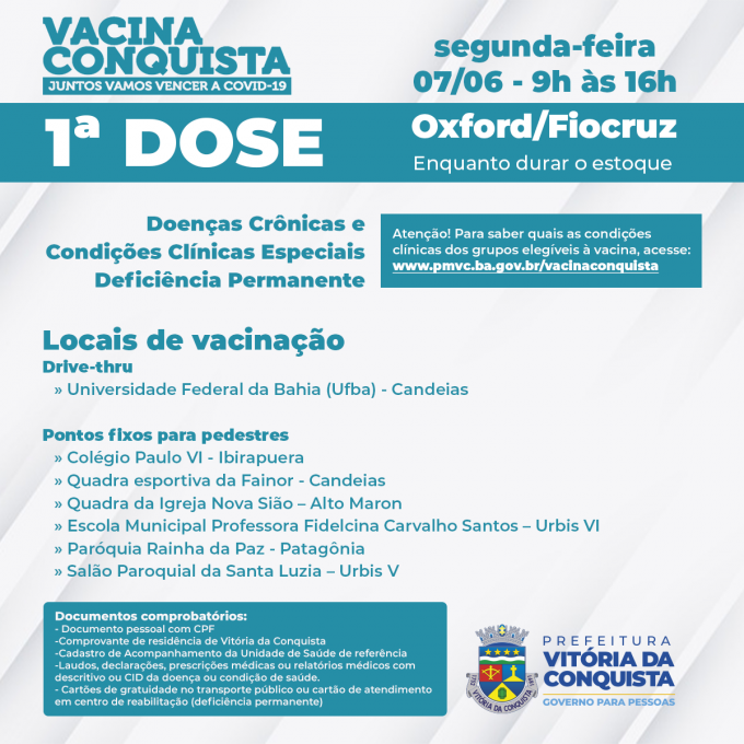 A primeira dose está disponível ainda para pessoas de 18 a 59 anos com deficiência permanente e dos grupos prioritários de portadores de doenças crônicas e condições especiais, observando as condições clínicas dos grupos elegíveis à vacina, conforme informações disponíveis no site www.pmvc.ba.gov.br/vacinaconquista.