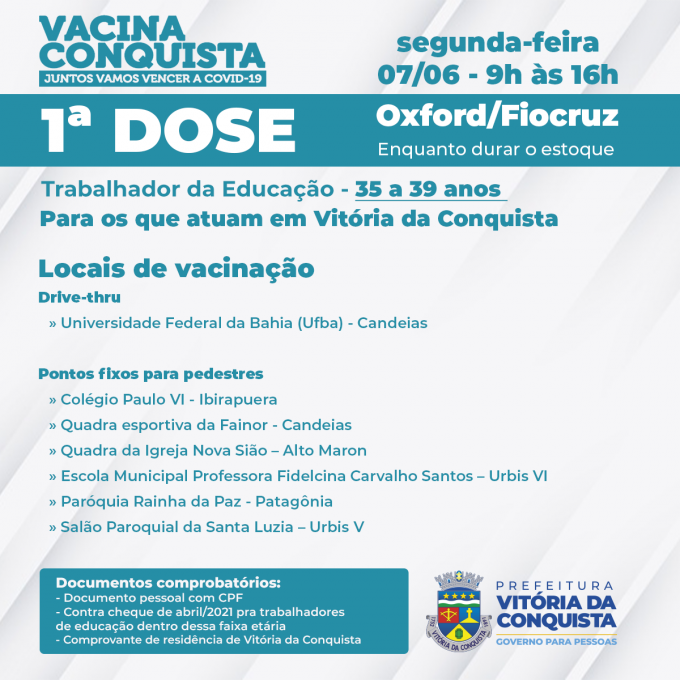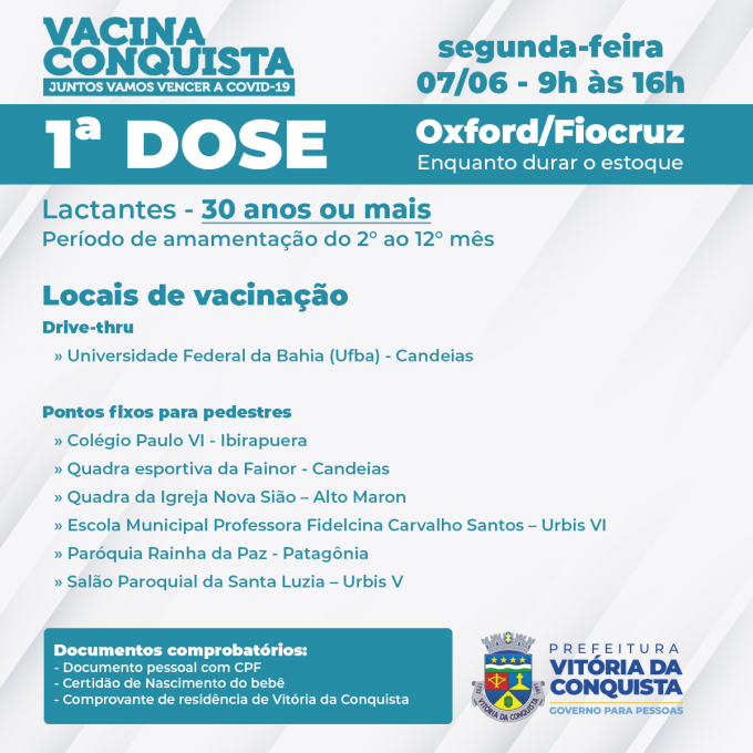 Documentos necessários – Para todos os grupos incluídos na vacinação, é preciso apresentar documento pessoal com CPF e comprovante de residência de Vitória da Conquista. Como documento comprobatório, as lactantes devem também levar a certidão de nascimento do bebê. Para os profissionais de educação que atuam em Vitória da Conquista, será exigido o contracheque de abril de 2021.