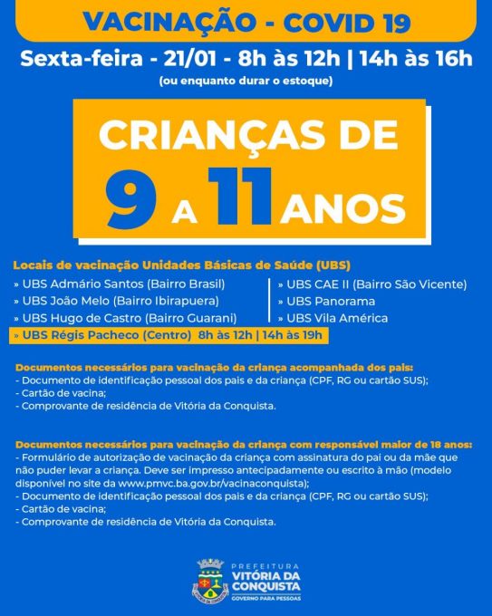 No momento da vacinação, os pais ou responsáveis devem acompanhar as crianças, apresentando o documento de identificação dos pais e da criança (CPF, RG ou cartão SUS), cartão de vacina e comprovante de residência de Vitória da Conquista. Para crianças com comorbidades ou deficiência permanente, é preciso apresentar também relatório médico que comprove a condição de saúde.