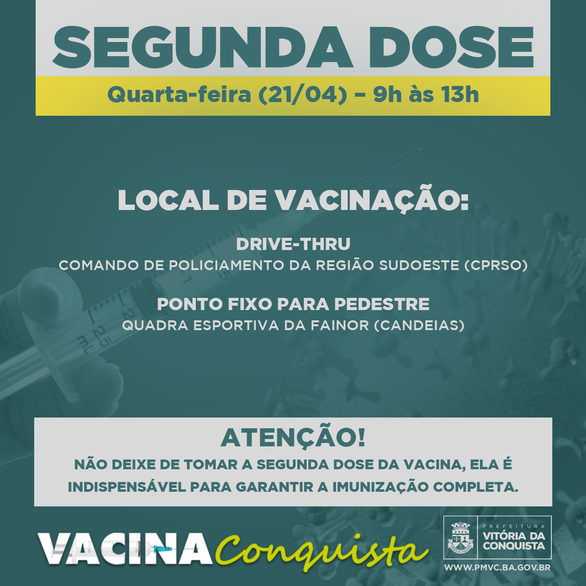 A 2ª dose começa às 9h e segue até às 13h no drive-thru do Comando de Policiamento da Região Sudoeste (CPRSO) e na quadra esportiva da Fainor para aqueles que não tiverem disponibilidade de veículo. Para receber a segunda dose, é necessário apresentar o cartão de vacina e o documento pessoal de identificação. Também será realizada a vacinação em domicílio dos idosos acamados e domiciliados nos roteiros pré-definidos.