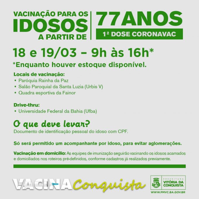 A vacinação acontece nessa quinta (18) e sexta (19), de 9h às 16h, no drive-thru na Universidade Federal da Bahia (UFBA), além dos pontos fixos para pedestres no Salão Paroquial da Santa Luzia (Urbis V), quadra esportiva da Fainor e Paróquia Rainha da Paz. Os idosos das etapas anteriores, que ainda não tiveram a oportunidade de serem vacinados, também podem se dirigir a um dos pontos de vacinação para receber a primeira dose.
