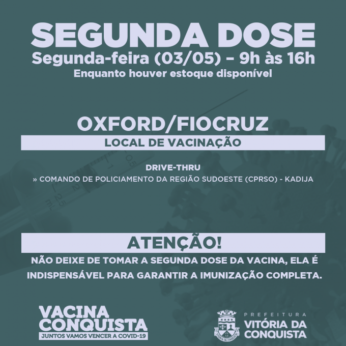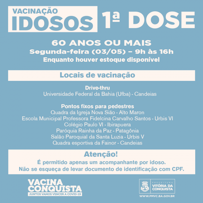 A vacinação contra a Covid-19 em Conquista seguirá nesta segunda-feira (3), de 9h às 16h, com a aplicação da 1ª dose para os idosos com 60 anos ou mais, além da 2ª dose da vacina de Oxford/Fiocruz para aqueles com data agendada para agora no cartão de vacina.