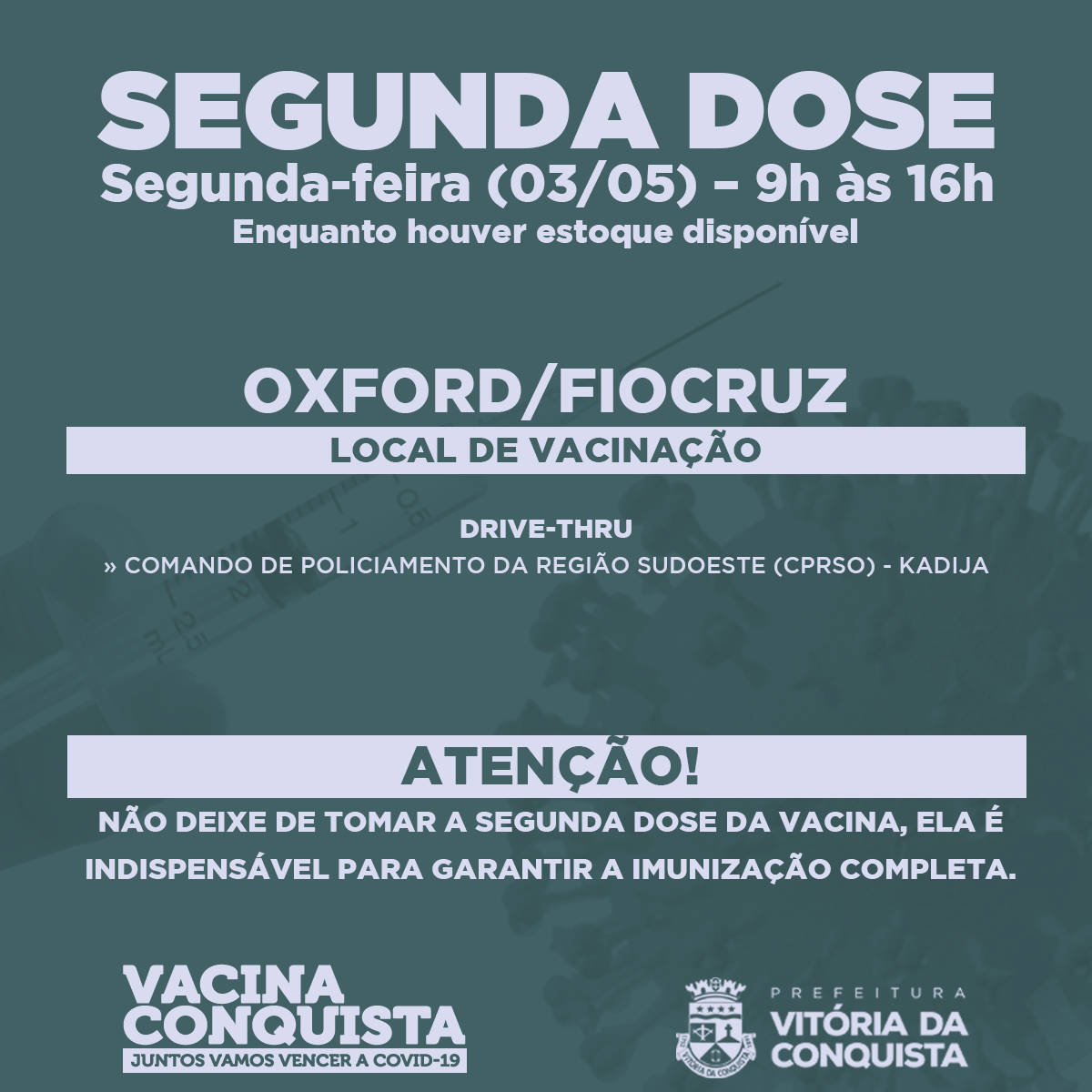 disponível em https://www.pmvc.ba.gov.br/vacinacao-prossegue-em-conquista-segunda-com-1a-dose-para-60-anos-ou-mais-e-2a-dose-da-oxford-fiocruz/2a-dose-2/ acessado em 30/10/2025 17:41:56