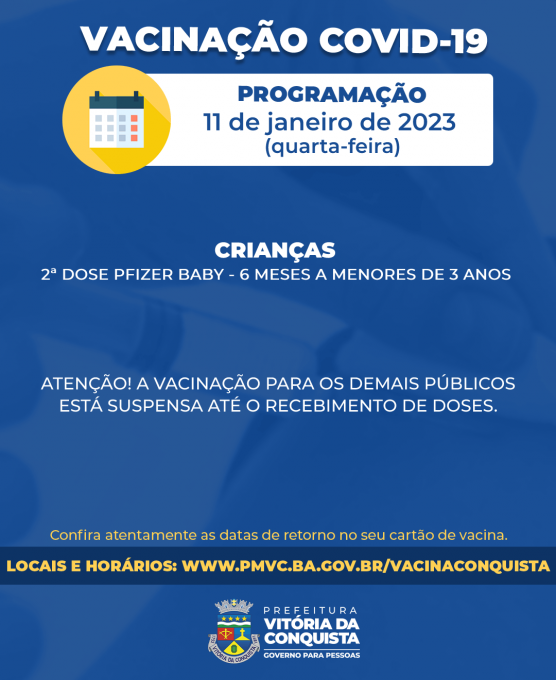 A vacinação com a 2ª dose da Pfizer Baby está disponível das 9h às 12h e das 14h às 16h30, somente nas unidades de saúde Régis Pacheco, no centro da cidade, e Dr. Admário Santos, no bairro Brasil. Os pais ou responsáveis devem apresentar o documento pessoal da criança, além da caderneta de vacinação.