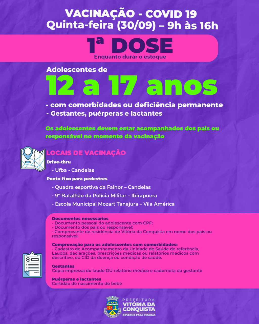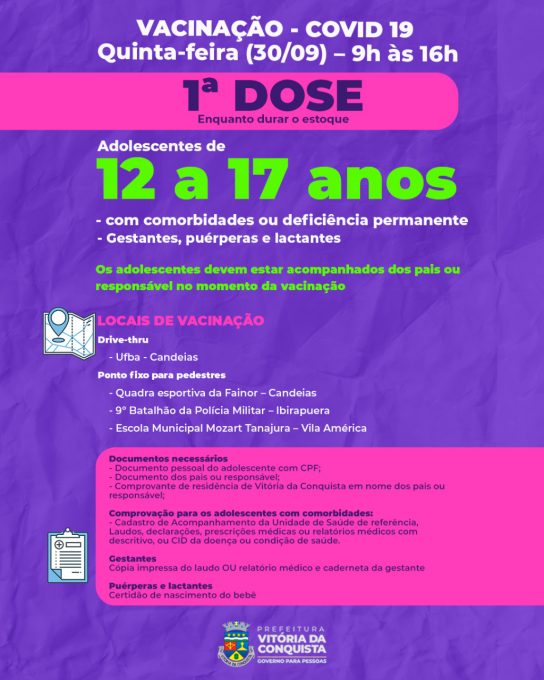 A aplicação da 1ª dose para os adolescentes será retomada nesta quinta-feira (30) na sede do município, atendendo a faixa etária de 16 e 17 anos, adolescentes com comorbidades ou deficiência permanente de 12 a 17 anos, além de gestantes, puérperas e lactantes de 12 a 17 anos.