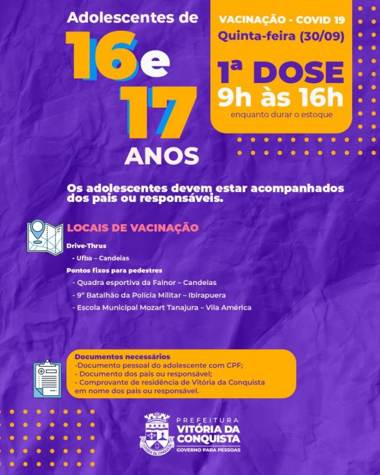 No momento da vacinação, os adolescentes precisam estar acompanhados dos pais ou responsável. É necessário apresentar documento pessoal do adolescente com CPF; documento dos pais ou responsável; comprovante de residência de Vitória da Conquista em nome dos pais ou responsável.