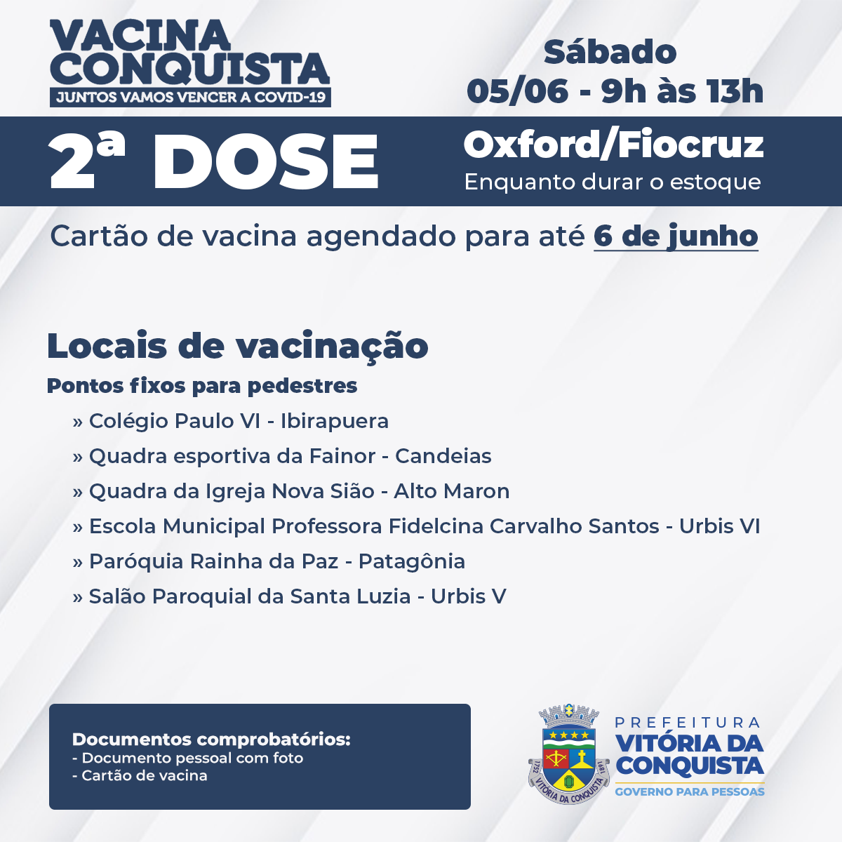 Conteúdo de Prefeitura Municipal de Vitória da Conquista – PMVC disponível em https://www.pmvc.ba.gov.br/vacinacao-sabado-2a-dose-atrasada-e-astrazeneca-trabalhadores-da-educacao-lactantes-e-pessoas-de-58-anos-ou-mais/card-2a-dose-6-de-junho/ acessado em 05/10/2025 11:01:32