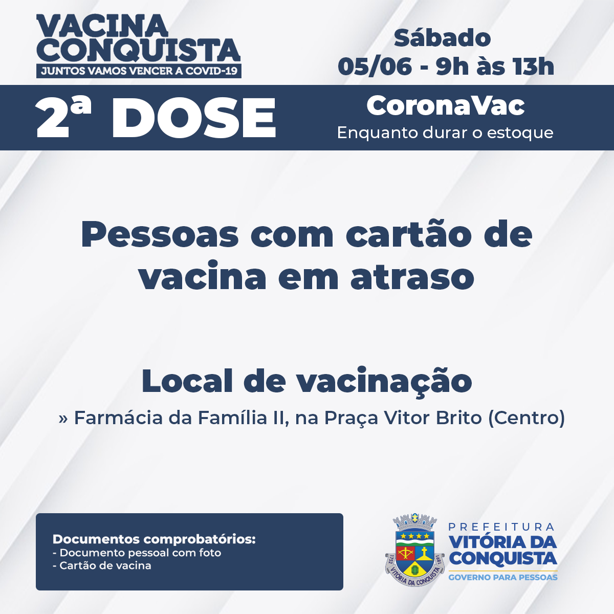 Conteúdo de Prefeitura Municipal de Vitória da Conquista – PMVC disponível em https://www.pmvc.ba.gov.br/vacinacao-sabado-2a-dose-atrasada-e-astrazeneca-trabalhadores-da-educacao-lactantes-e-pessoas-de-58-anos-ou-mais/card-2a-dose-vacina-em-atraso/ acessado em 05/10/2025 14:04:48