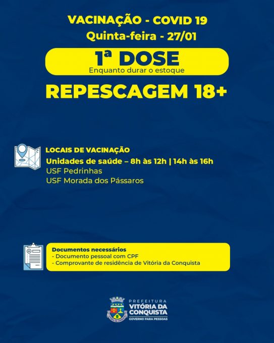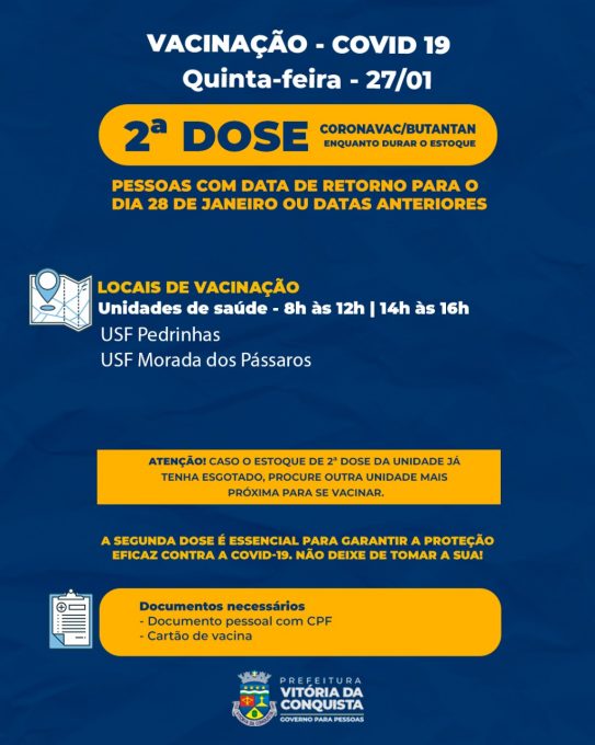 Para as pessoas que precisam tomar a 2ª dose da Pfizer, com retorno agendado até dia 28 de janeiro, ou está com a 2ª dose da Fiocruz/Oxford em atraso, poderá procurar as unidades de saúde da família Conveima, Solange Hortélio (Urbis II), Jardim Valéria e Miro Cairo. Com a falta do imunizante da Fiocruz/Oxford no município, a 2ª dose está sendo feita com a vacina da Pfizer.