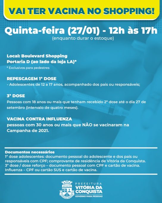 A Secretaria Municipal de Saúde (SMS) prossegue com a vacinação nesta quinta-feira (27) para adolescentes e adultos no Boulevard Shopping, de 12h às 17h, e nas unidades de saúde, de 8h às 12h e de 14h às 16h, com distribuição de senha. Além da vacinação contra a Covid-19, haverá também, exclusivamente no Boulervard, a vacinação contra a Influenza para as pessoas com 30 anos ou mais que não se vacinaram na Campanha de 2021.