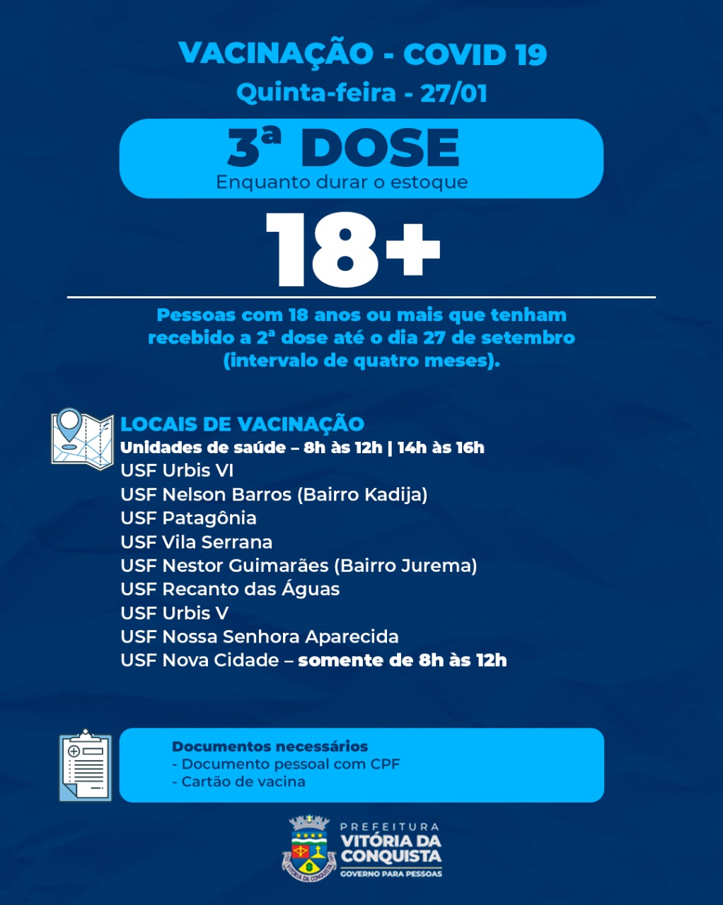 A 3ª dose também estará disponível nas unidades para quem tem 18 anos ou mais que receberam a 2ª dose até o dia 27 de setembro (intervalo de quatro meses), além de imunossuprimidos que tomaram a 2ª dose até o dia 26 de dezembro (intervalo de 28 dias). A vacinação será nas unidades de saúde Urbis VI, Nelson Barros (Bairro Kadija), Patagônia, Vila Serrana, Nestor Guimarães (Bairro Jurema), Recanto das Águas, Urbis V e Nossa Senhora Aparecida. Na unidade de saúde Nova Cidade, a vacinação acontece apenas no turno da manhã.