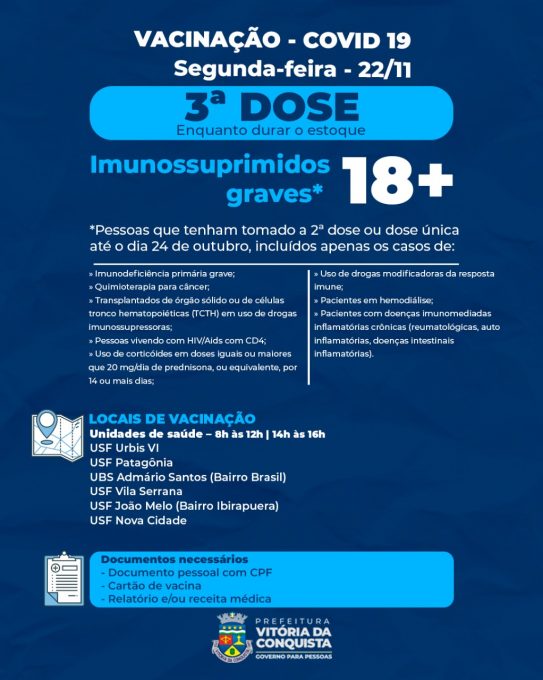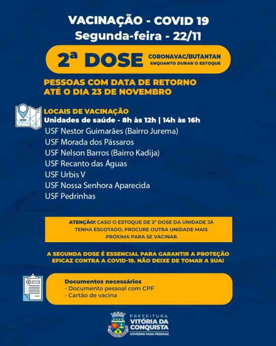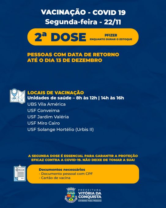 SEGUNDA DOSE – Nas unidades de saúde a vacinação é das 8h às 12h e das 14h às 16h. A 2ª dose da Pfizer continua com a data de adiantamento para o dia 13 de dezembro em cinco unidades de saúde.