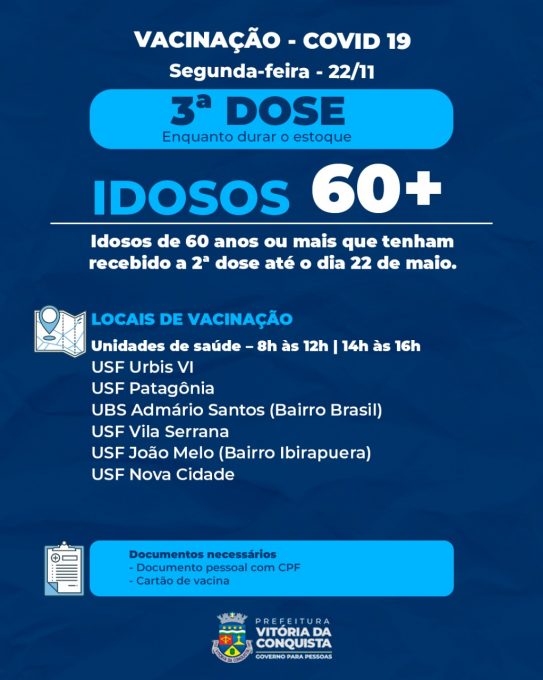 Por enquanto, a 3ª dose continua disponível apenas para os idosos de 60 anos ou mais que tenham tomado a 2ª dose até o dia 22 de maio, além das pessoas com imunossupressão que tomaram a 2ª dose até o dia 24 de outubro.