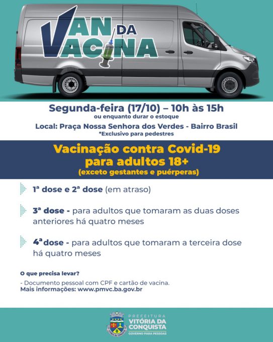 A Van da Vacina volta à ativa na próxima segunda-feira (17), dessa vez na Praça Nossa Senhora dos Verdes, no Bairro Brasil, das 10h às 15h. Serão oferecidas a 1ª, 2ª, 3ª e 4ª doses da vacina contra a Covid-19 para os adultos com mais de 18 anos, com exceção de gestantes e puérperas.