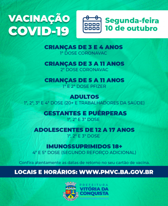 As unidades de saúde de Vitória da Conquista recomeçam, nesta segunda-feira (10), a vacinação contra a Covid-19 com todas as doses para os públicos infantil, juvenil, adulto e grupos prioritários.