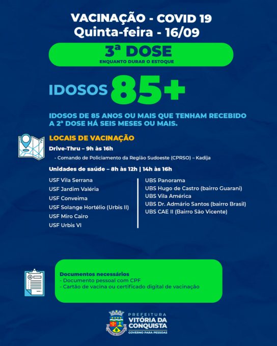 3ª dose dos idosos de 85+ – Serão vacinados todos os idosos nesta faixa etária que tenham recebido a 2ª dose há seis meses ou mais. A vacinação será em 12 pontos de vacinação. De 9h às 16h no drive-thru do Comando de Policiamento da Região Sudoeste (CPRSO), no Kadija.