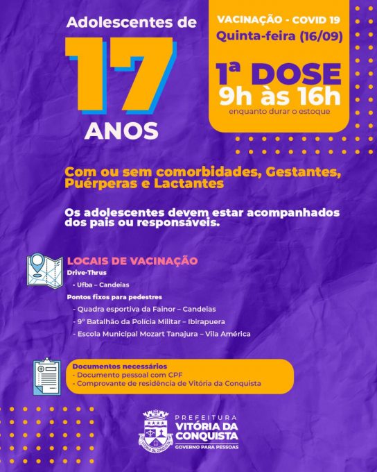 1ª dose adolescentes de 17 anos – A vacinação será exclusiva para os adolescentes desta faixa etária acompanhados dos pais ou responsáveis, de 9h às 16h, no drive-thru da Ufba (Candeias) e nos pontos fixos da Escola Municipal Mozart Tanajura (Vila América), quadra esportiva da Fainor (Candeias) e 9º Batalhão da Polícia Militar (Ibirapuera).