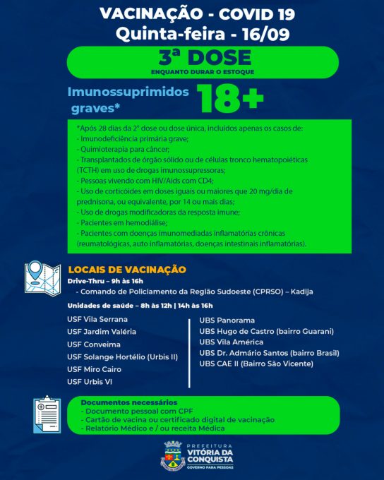 3ª dose dos imunossuprimidos graves 18+ – A vacinação deste grupo ocorrerá nos mesmos locais dos idosos que também receberão a dose de reforço. Poderão se vacinar todos os imunossuprimidos, que tenham recebido sua segunda dose há 28 dias.