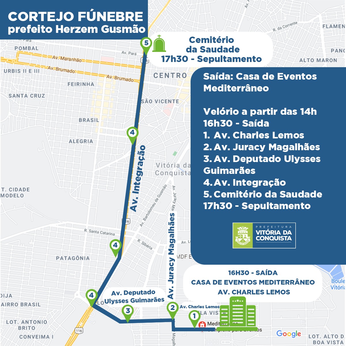 A Prefeitura de Vitória da Conquista informa que, devido a mudanças no horário do voo que trará o corpo do prefeito para Vitória da Conquista, os horários do velório e sepultamento foram alterados. O velório terá início às 14 horas e o sepultamento ocorrerá por volta das 17h30, deste sábado (20).